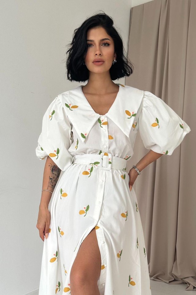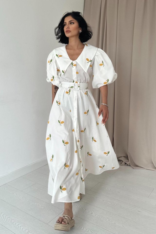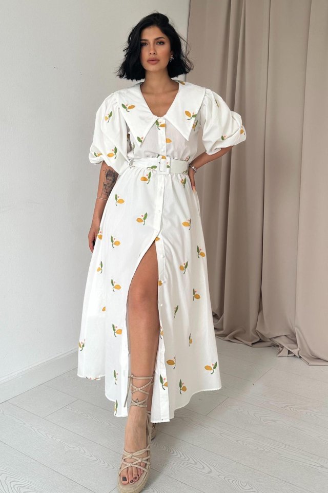 Pembe Yakası Çiçek Motifli Kemerli Elbise