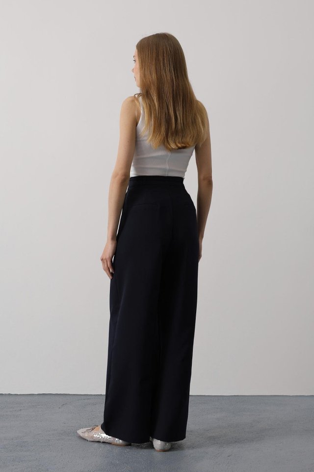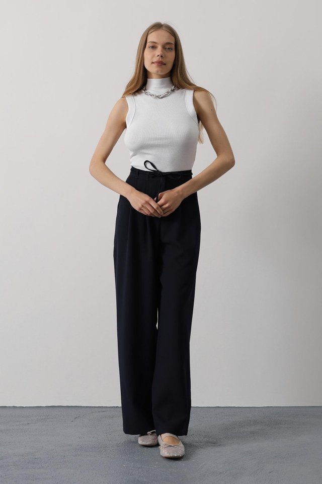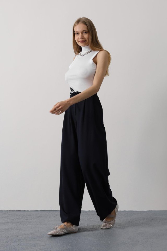 Pileli Bağcıklı Oversize Pantolon - Siyah