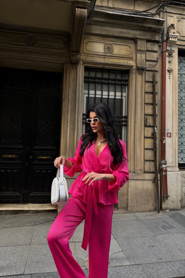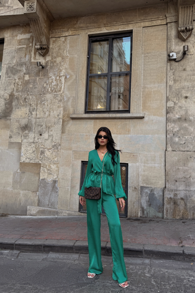 SATEN KRUVAZE BAĞLAMALI BLUZ- PANTOLON TAKIM - Siyah