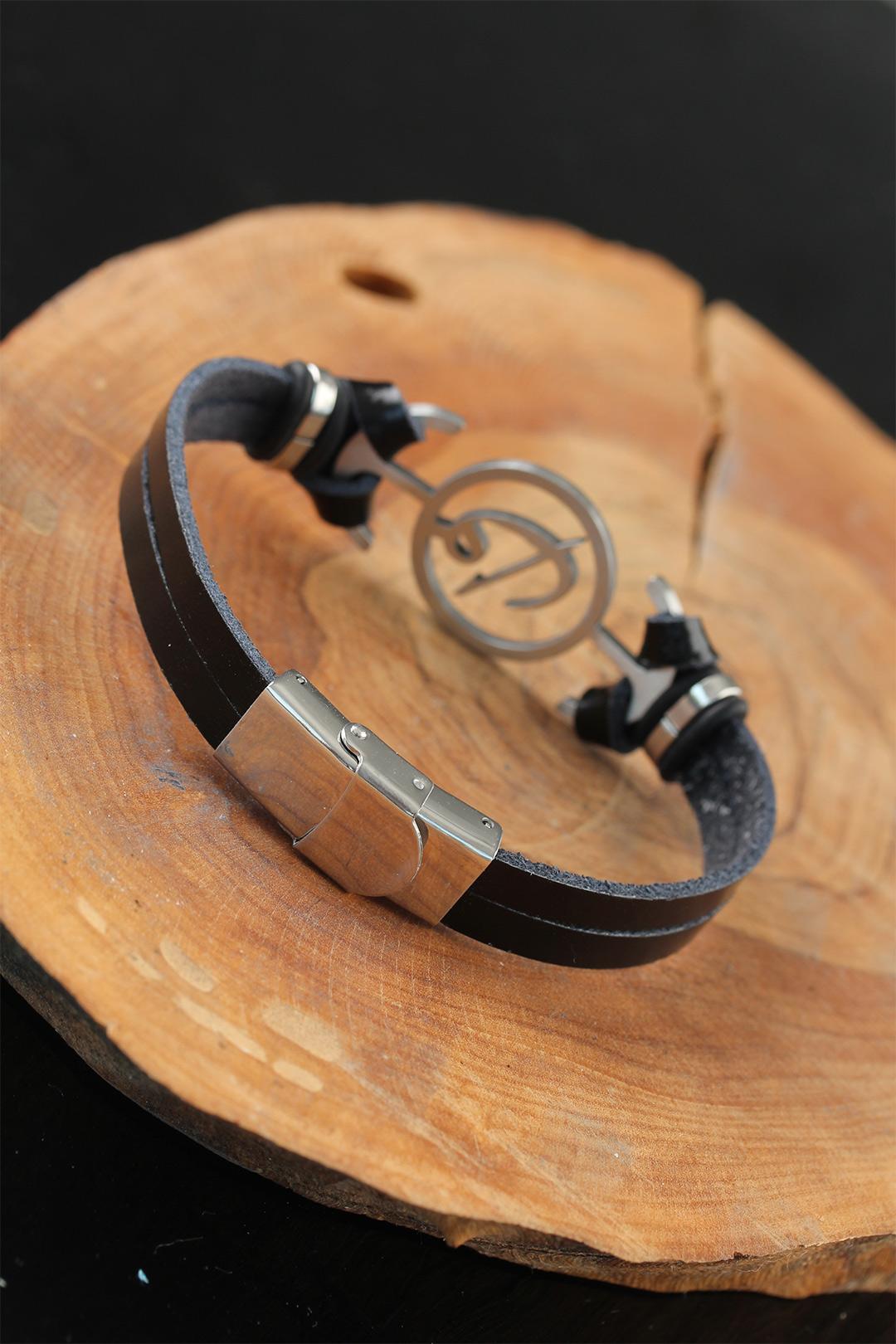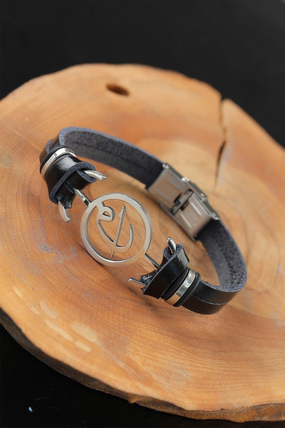 Silver Renk Elif Vav Çelik Aksesuarlı Siyah Renk Deri Erkek Bileklik