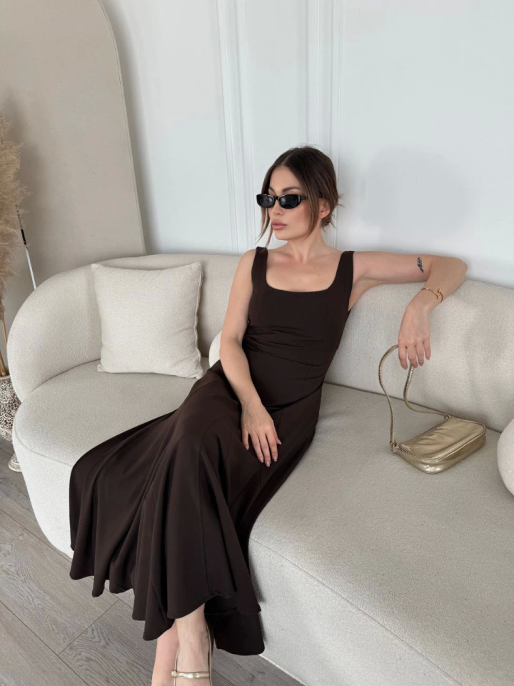 Sırt Dekolteli Kolsuz Uzun Elbise - Kahverengi