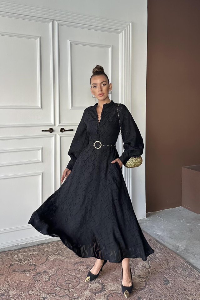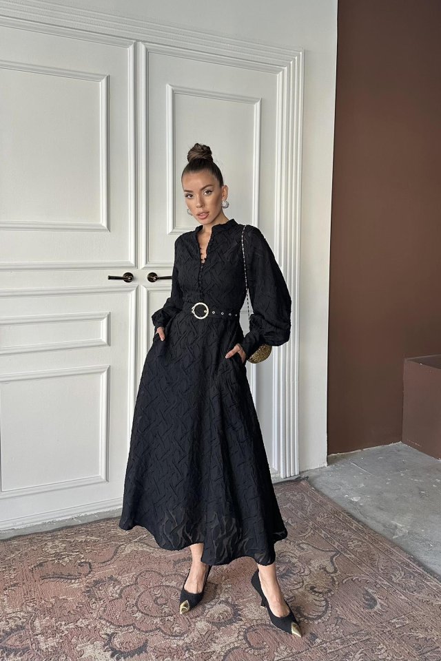 Siyah Kemer Detaylı Uzun Elbise