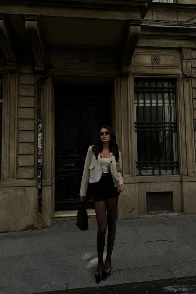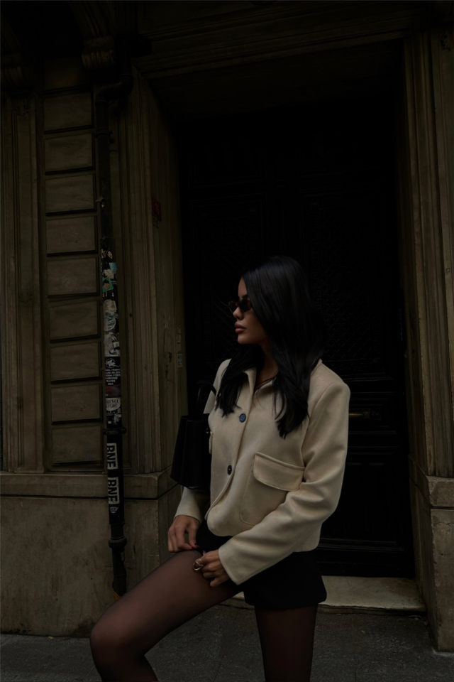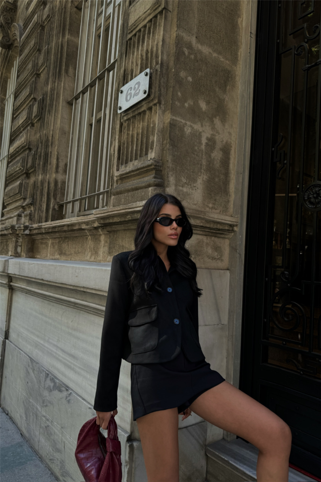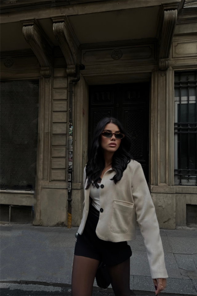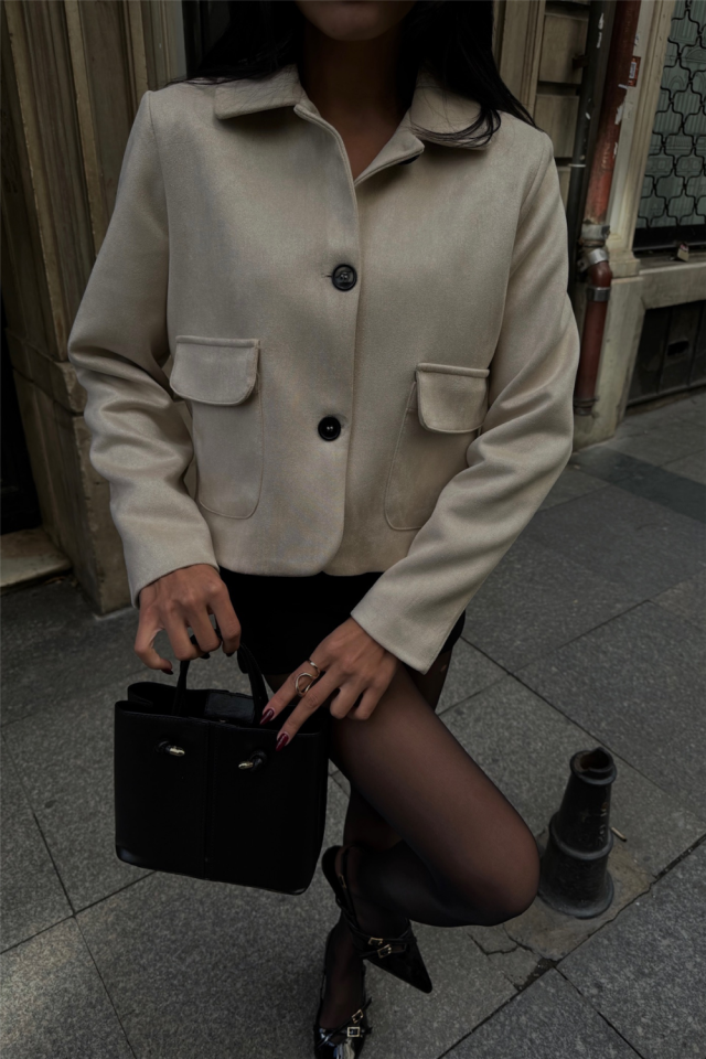 SÜET CROP CEKET KAPAKLI CEP DETAYLI - Taş