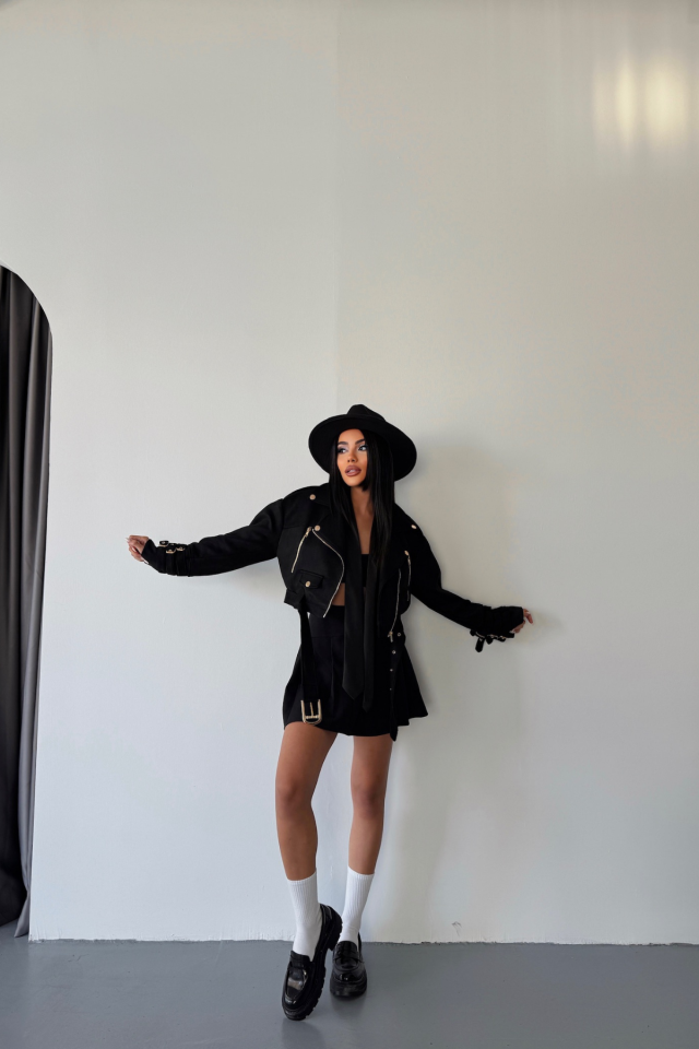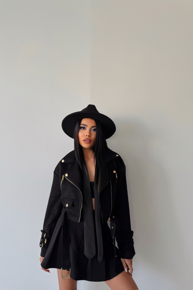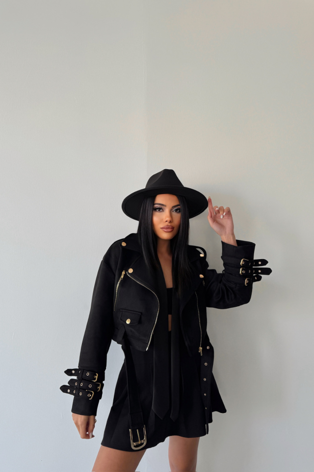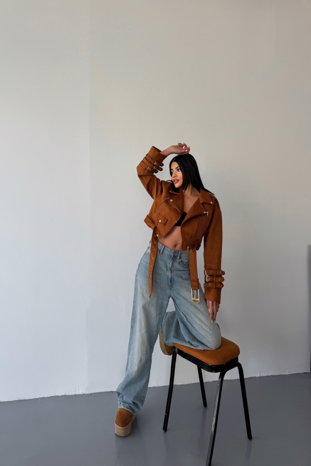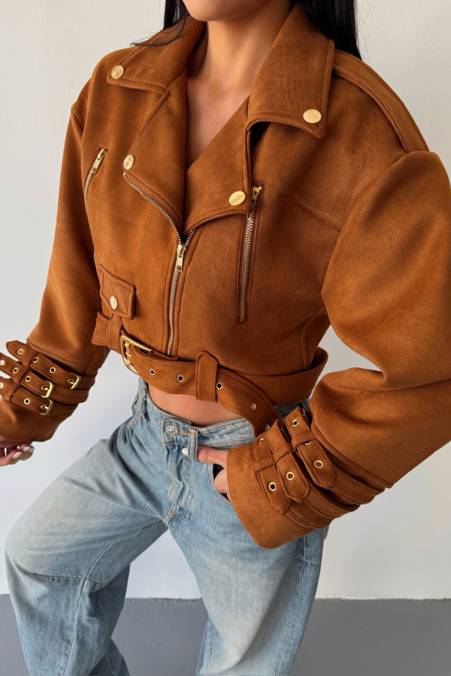 SÜET CROP CEKET KOL 3 KEMER DETAYLI - Taba