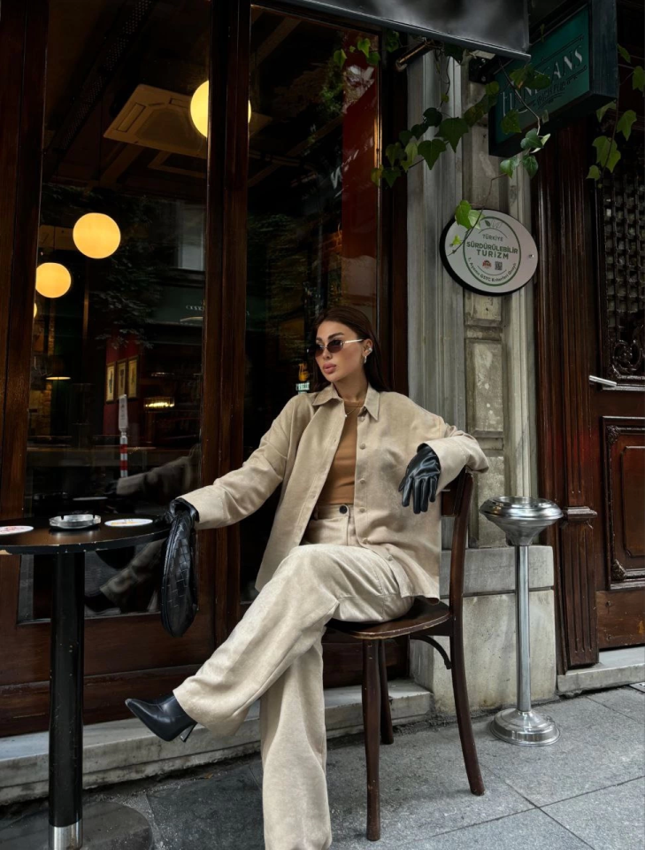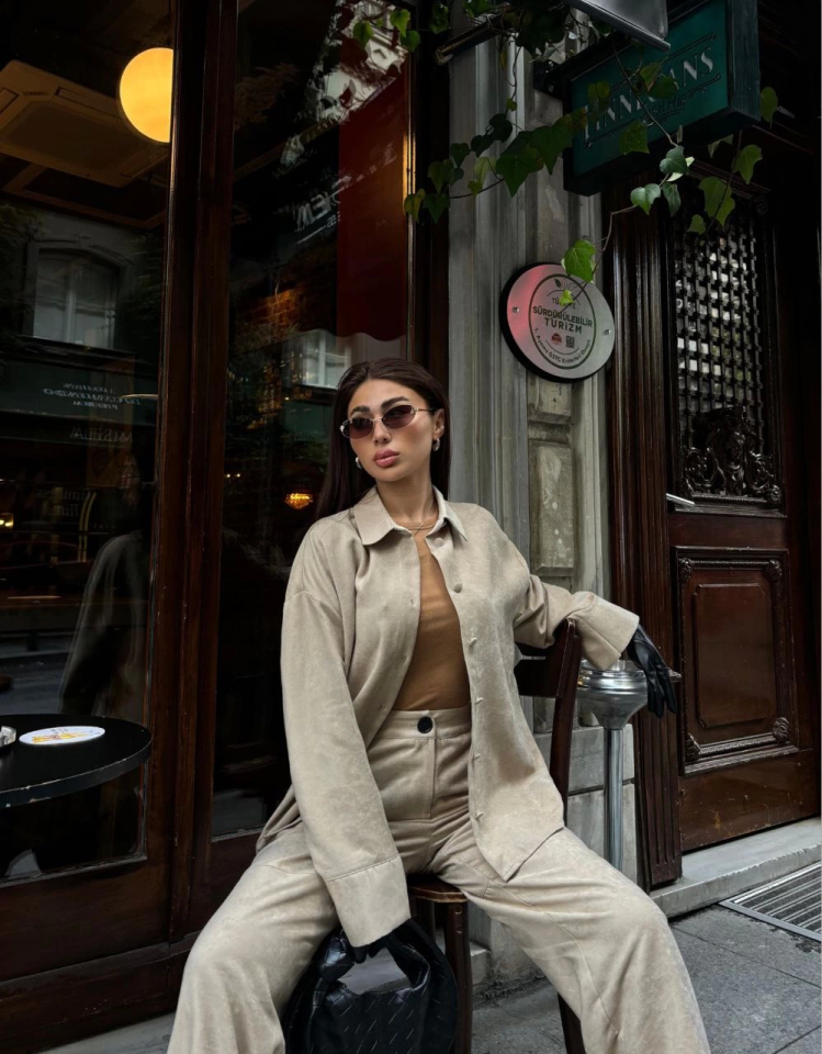 Süet Gömlek Palazzo Pantolon İkili Takım - Bej