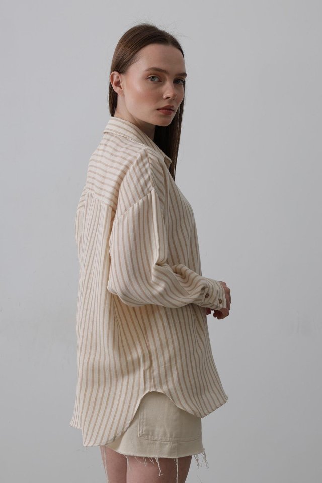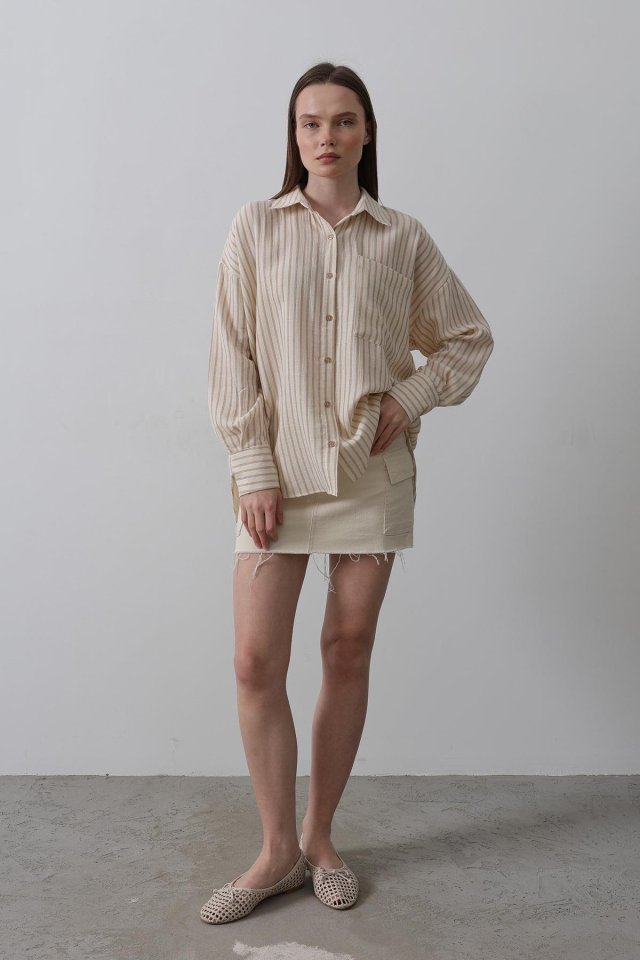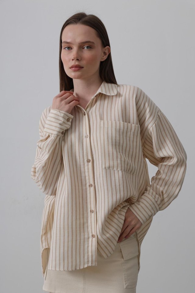 Tek Cep Çizgili Gömlek - Bej-Taba