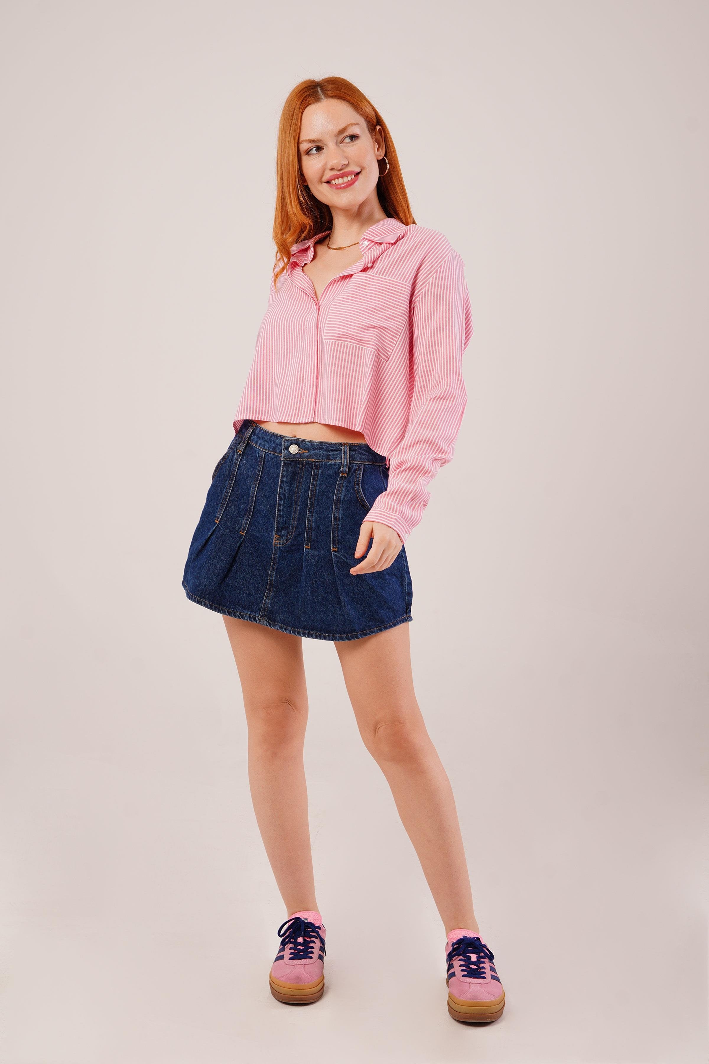 Tek Cep Çizgili Pembe Kısa Gömlek