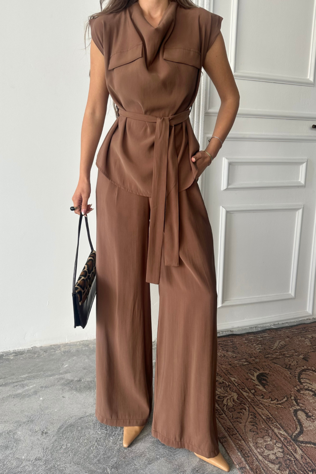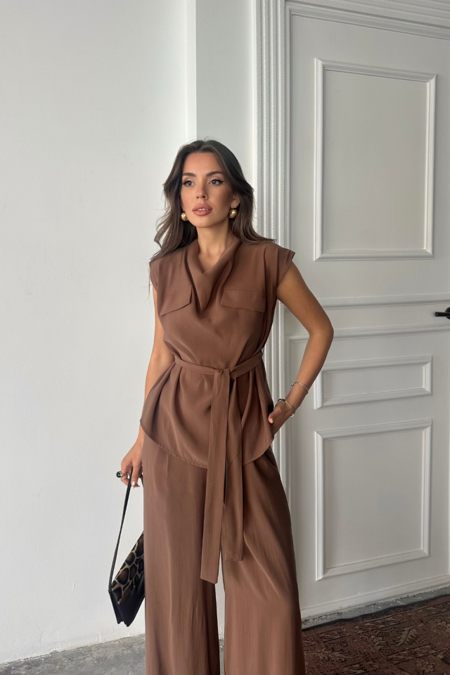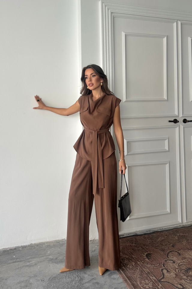 TENCEL MODAL KOLSUZ BLUZ KAPALI CEP DETAYLI DÖKÜMLÜ - PANTOLON TAKIM - Kahverengi