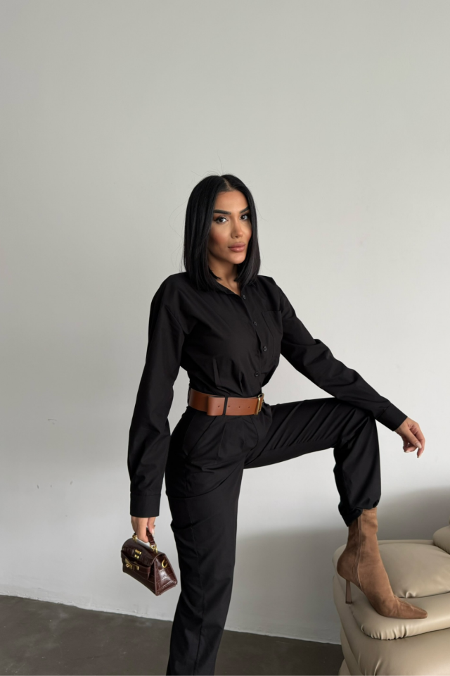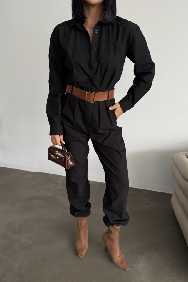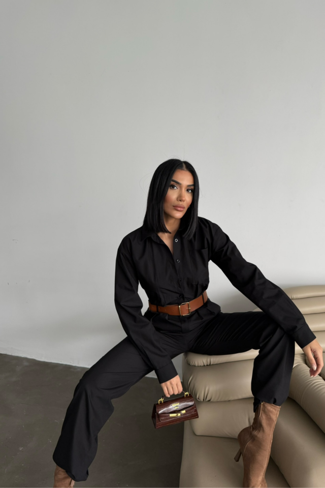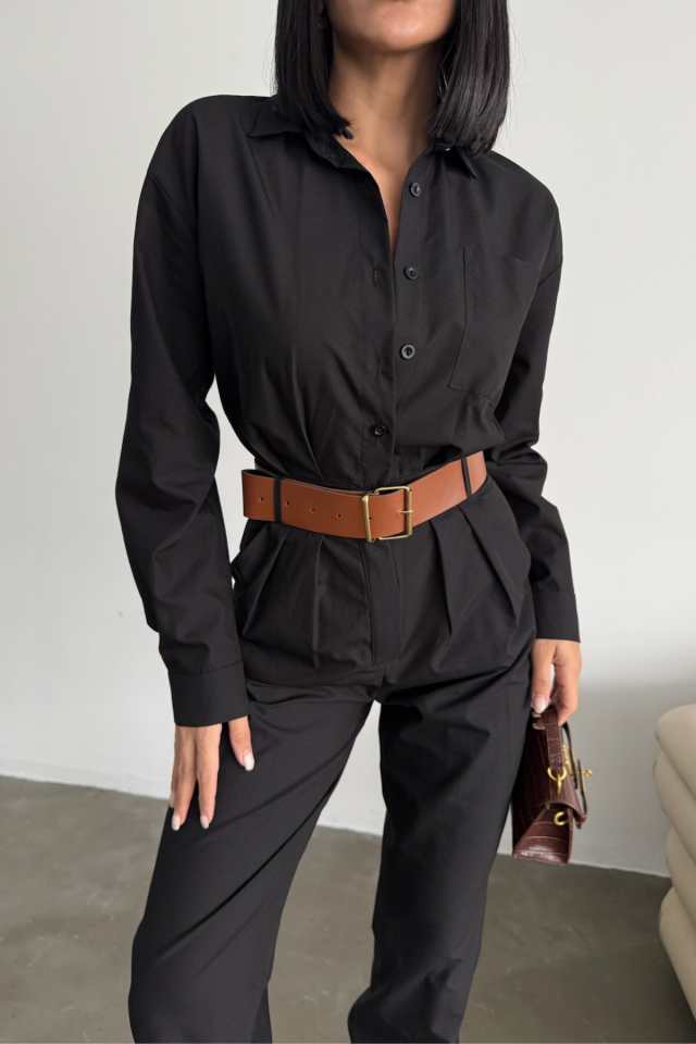 TULUM KEMERLİ GÖMLEK YAKA UZUN KOL POPLİN KUMAŞ - Siyah