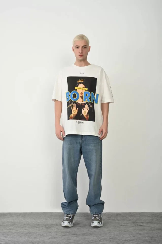 Unisex Baskılı Bisiklet Yaka Oversize T-Shirt - Beyaz