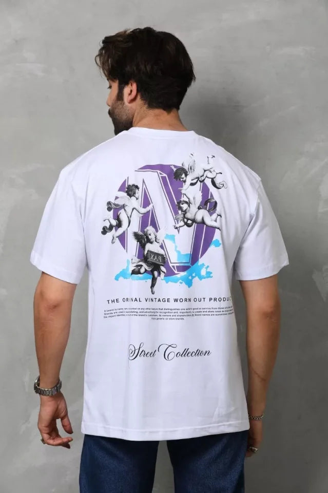 Unisex Bisiklet Yaka Baskılı Oversize T-Shirt - Beyaz