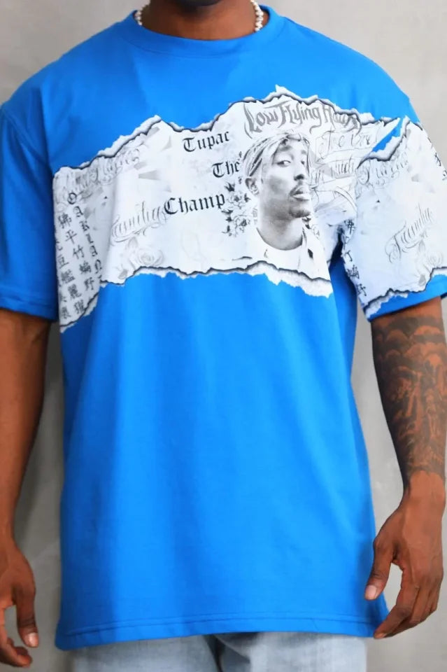Unisex Bisiklet Yaka Baskılı Oversize T-Shirt - Mavi