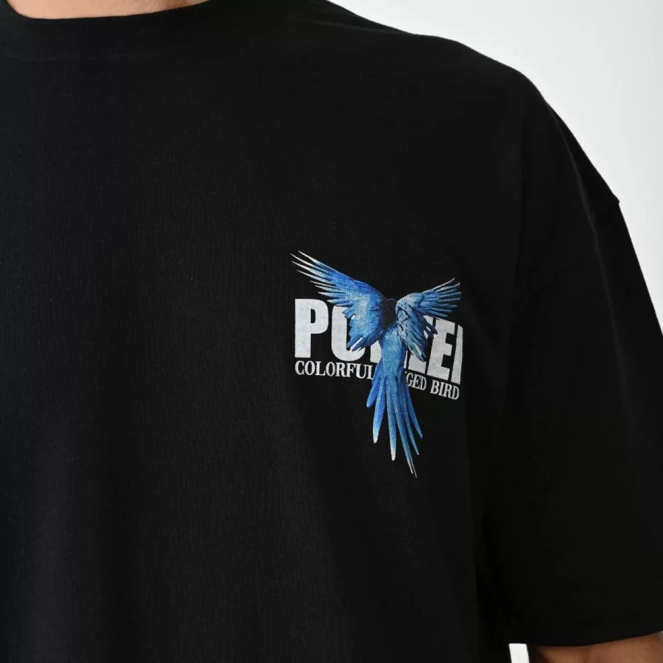 Unisex Bisiklet Yaka Baskılı Oversize T-Shirt - Siyah