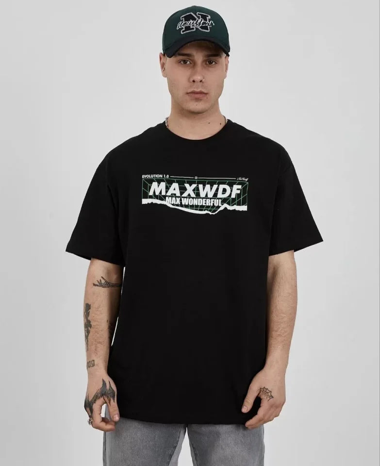 Unisex Bisiklet Yaka Baskılı Oversize T-Shirt - Siyah