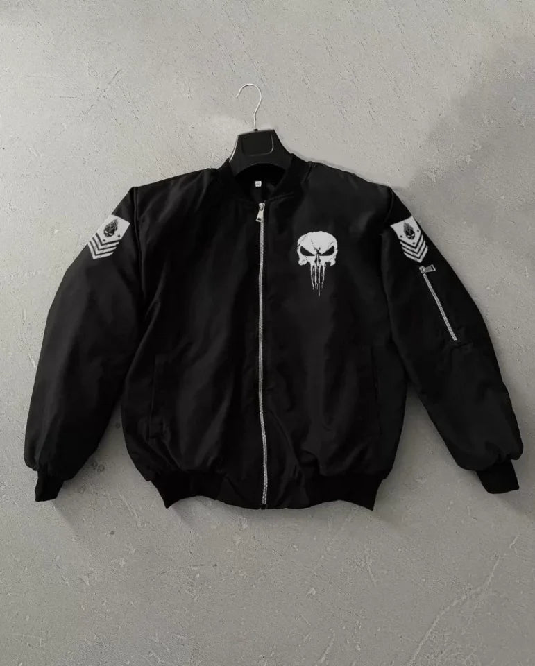 Unisex Uzun Kol Kuru Kafa Baskılı Bomber Ceket - Siyah