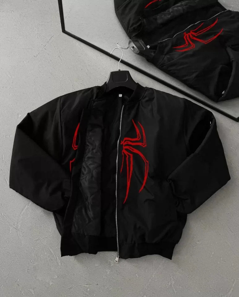 Unisex Uzun Kol Örümcek Baskılı Bomber Ceket - Siyah