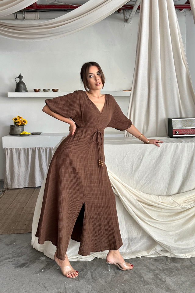 V YAKA BEL BONCUK BAĞLAMALI MÜSLİN ELBİSE YIRTMAÇ DETAYLI - Kahverengi