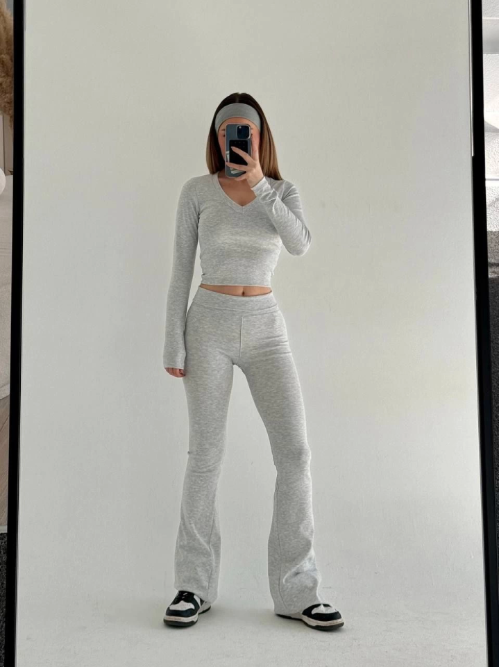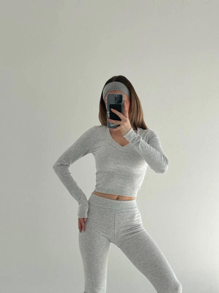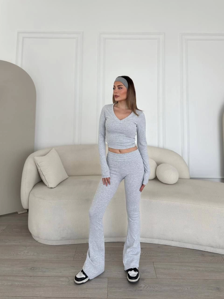 V Yaka Uzun Kollu Bluz İspanyol Paçalı Tayt İkili Takım - Gri