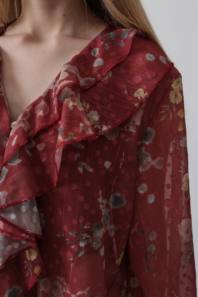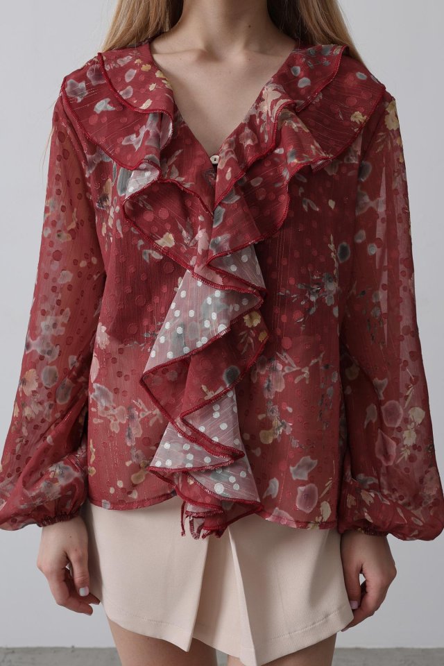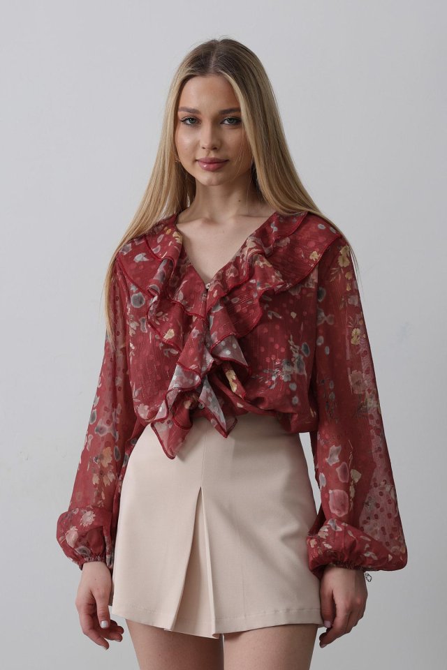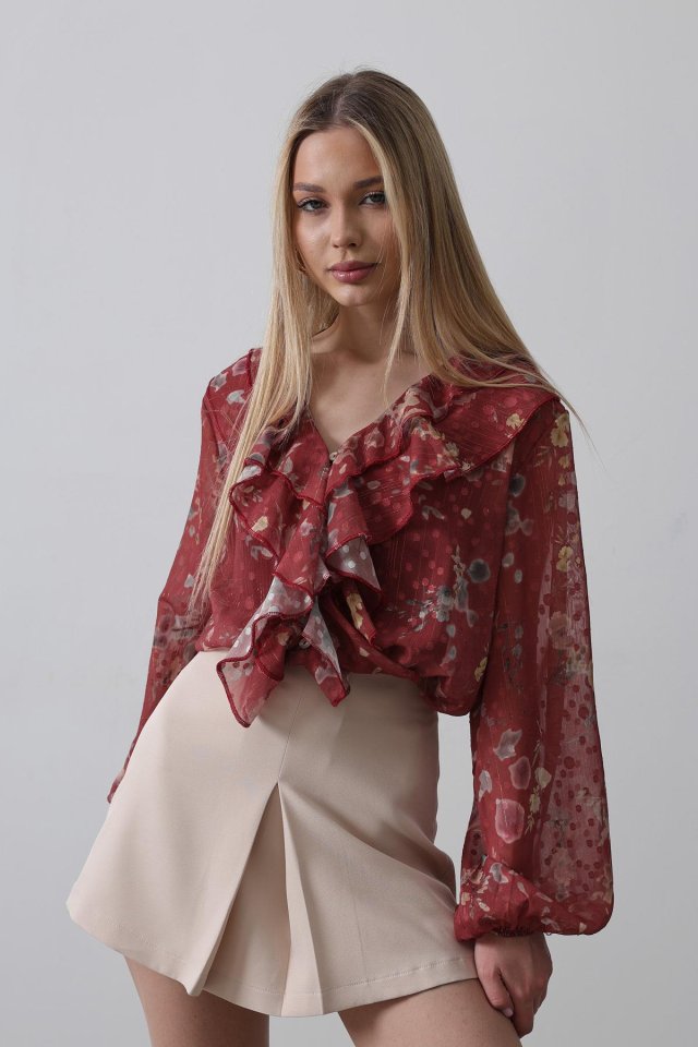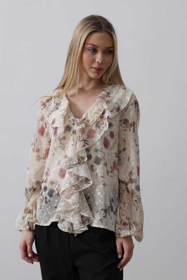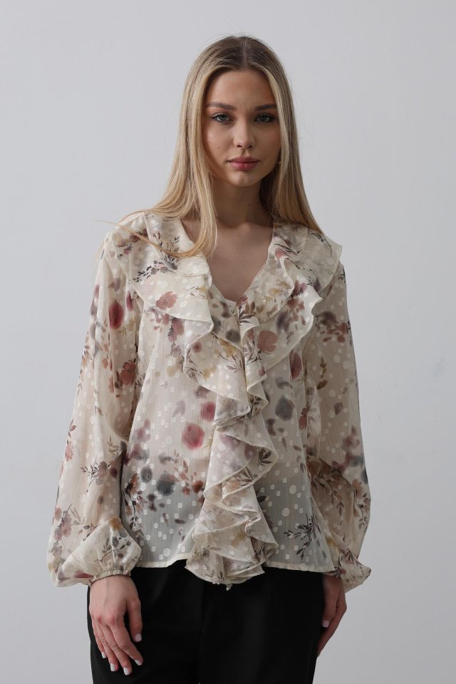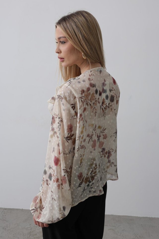Volanlı Çiçek Desen Şifon Gömlek - Krem