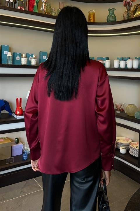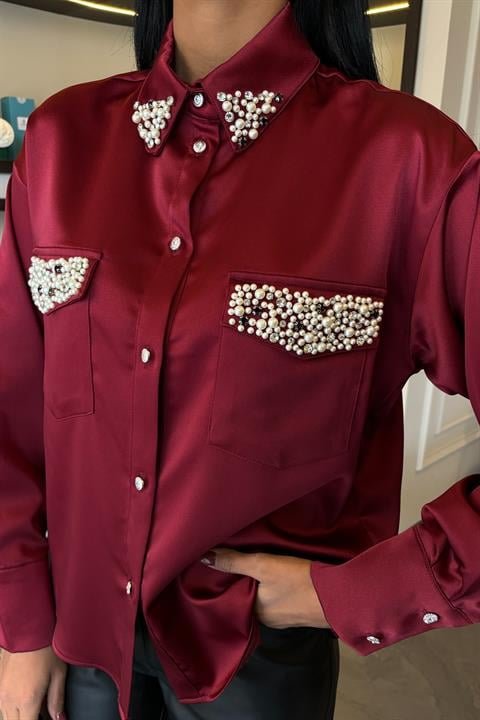 Yaka Ve Cep İnci Taşlı Saten Gömlek 3423