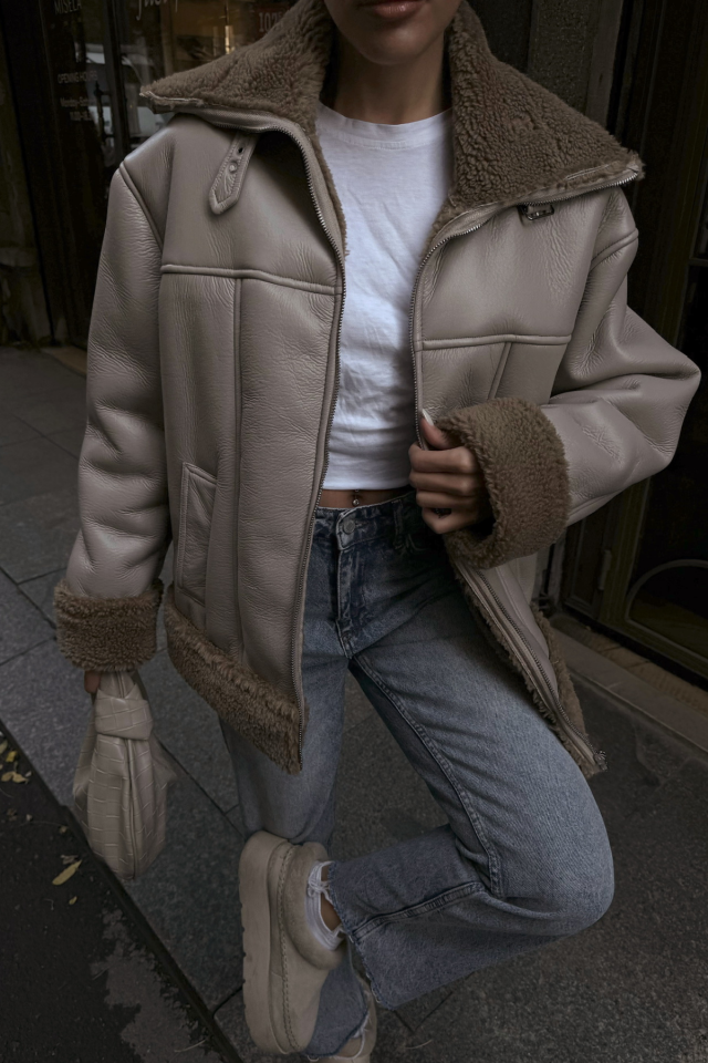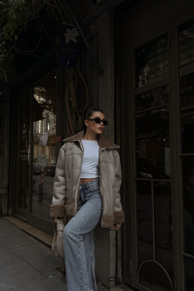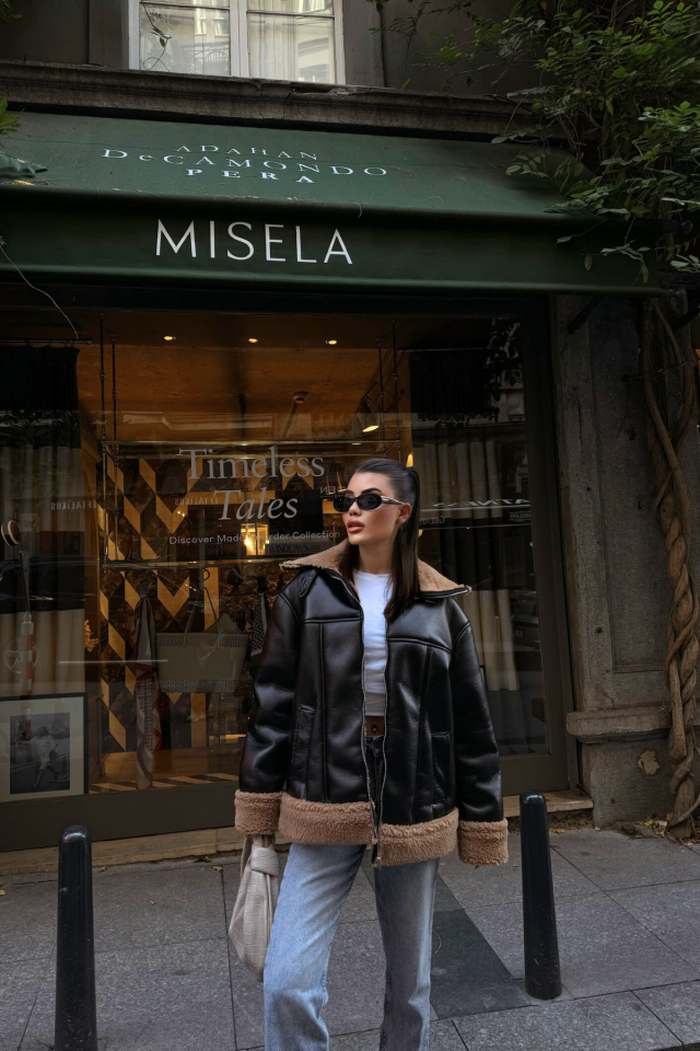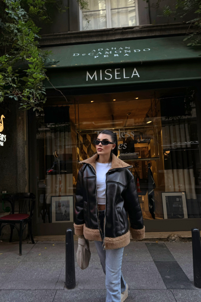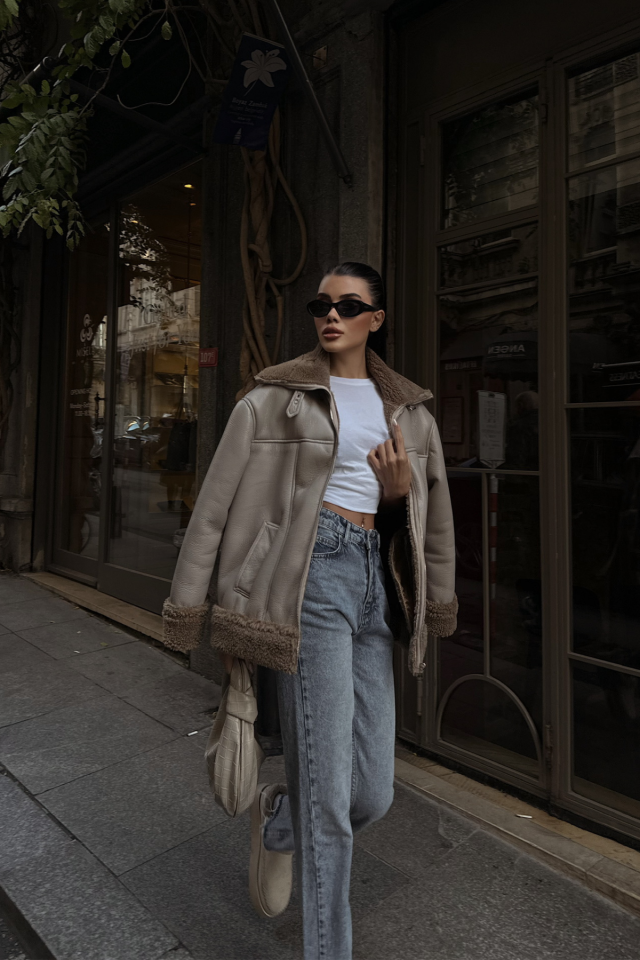 YAKA VE KOL MANŞET KÜRK DETAYLI DERİ MONT - Vizon