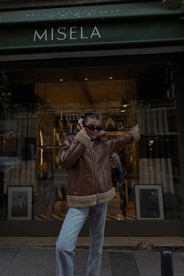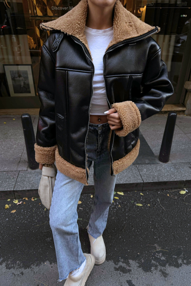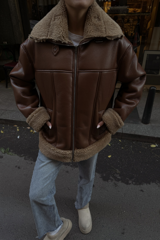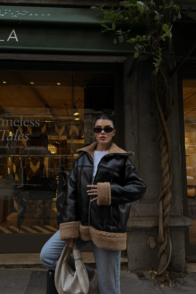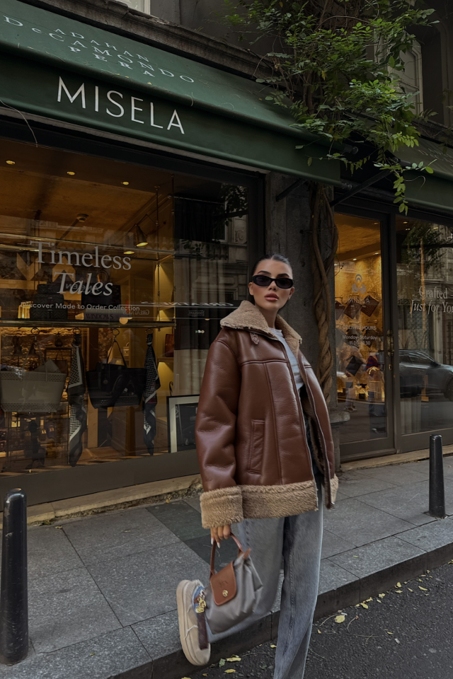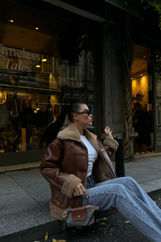 YAKA VE KOL MANŞET KÜRK DETAYLI DERİ MONT - Vizon