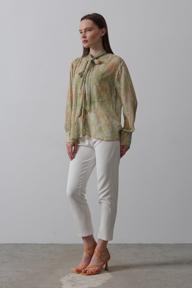 Yakası Fularlı Şifon Gömlek - Fıstık Yeşili