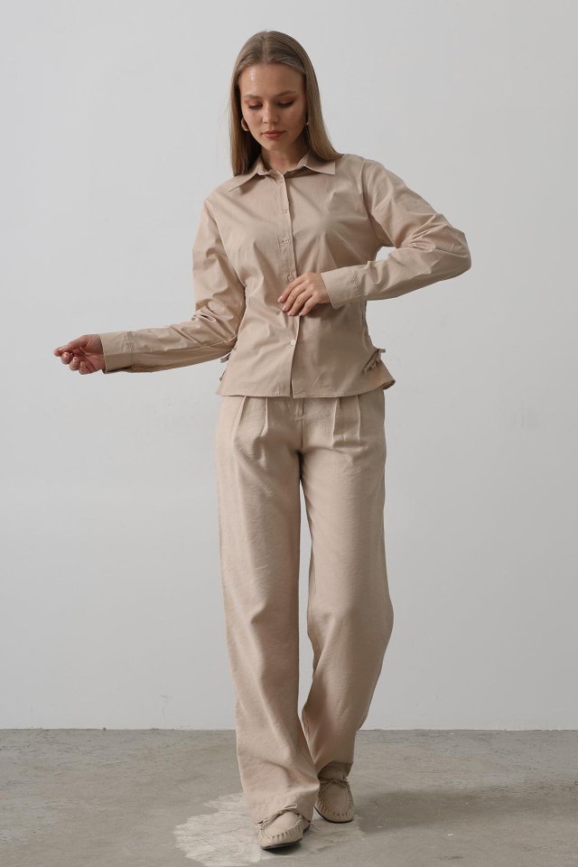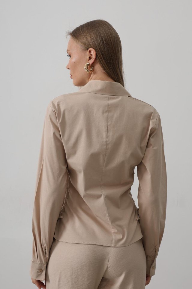 Yanları Büzgülü Çizgili Gömlek - Camel
