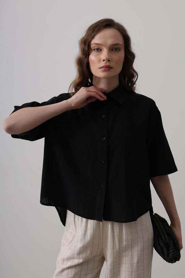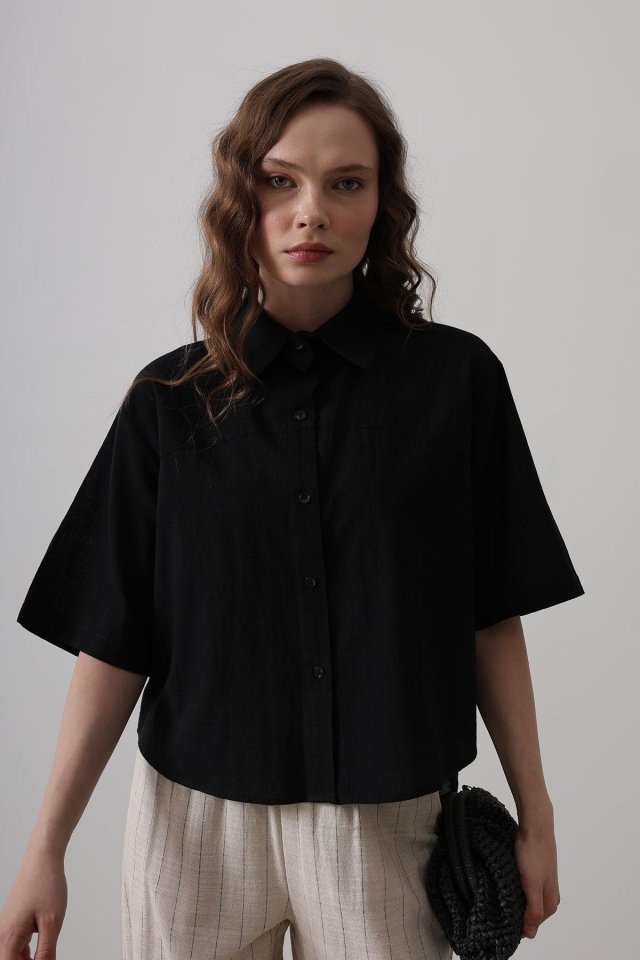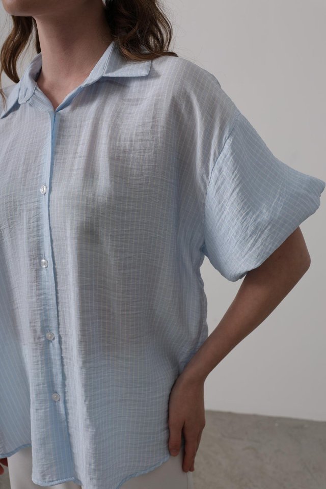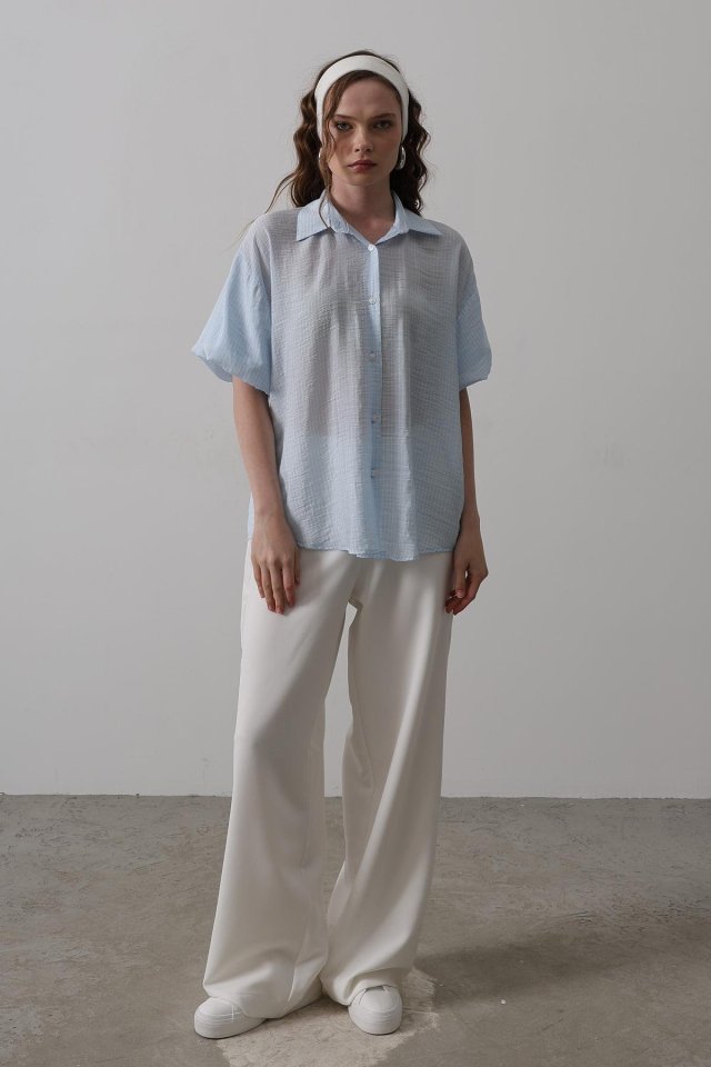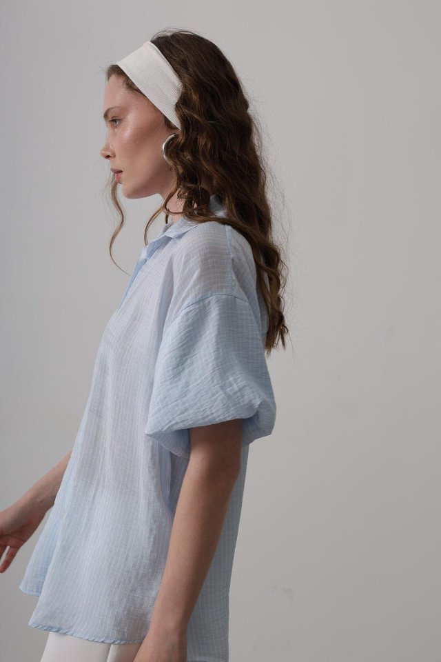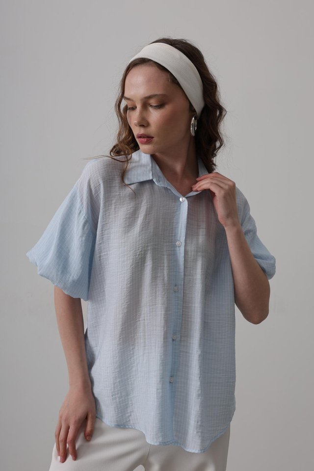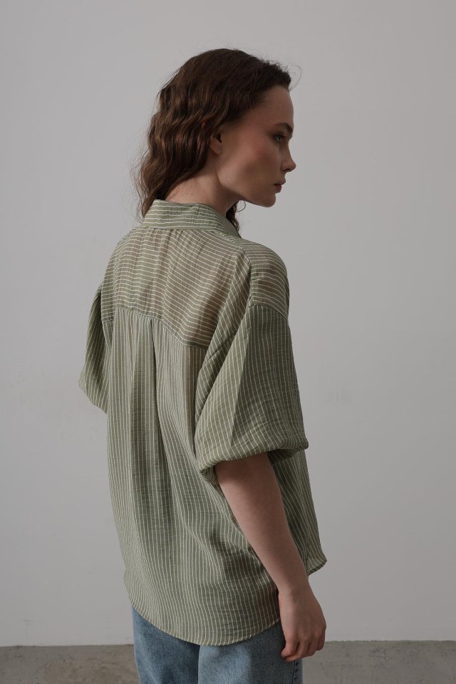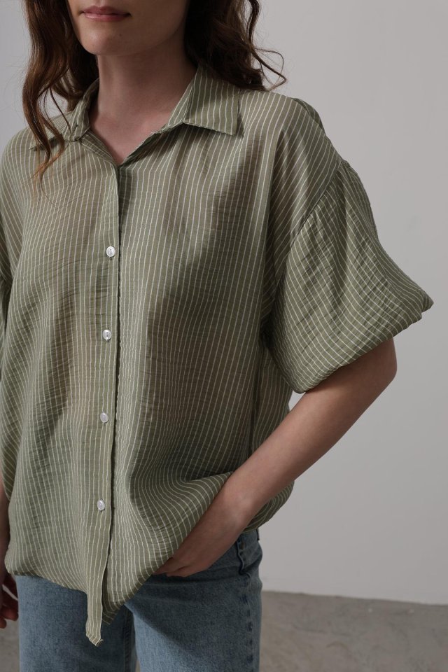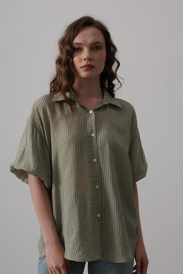 Yarım Balon Kol Çizgili Gömlek - Haki