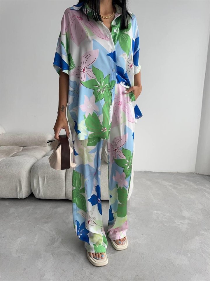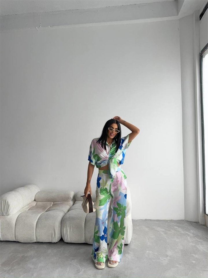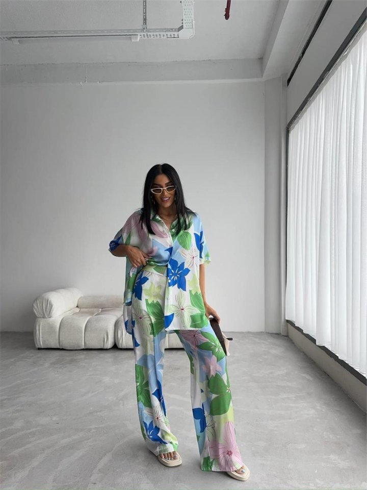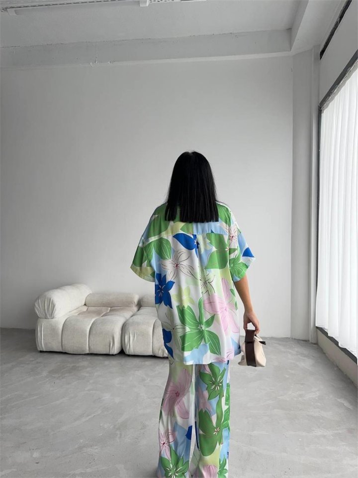 YEŞİL BÜYÜK ÇİÇEK DESEN SATEN GÖMLEK-PANTOLON TAKIM - Yeşil