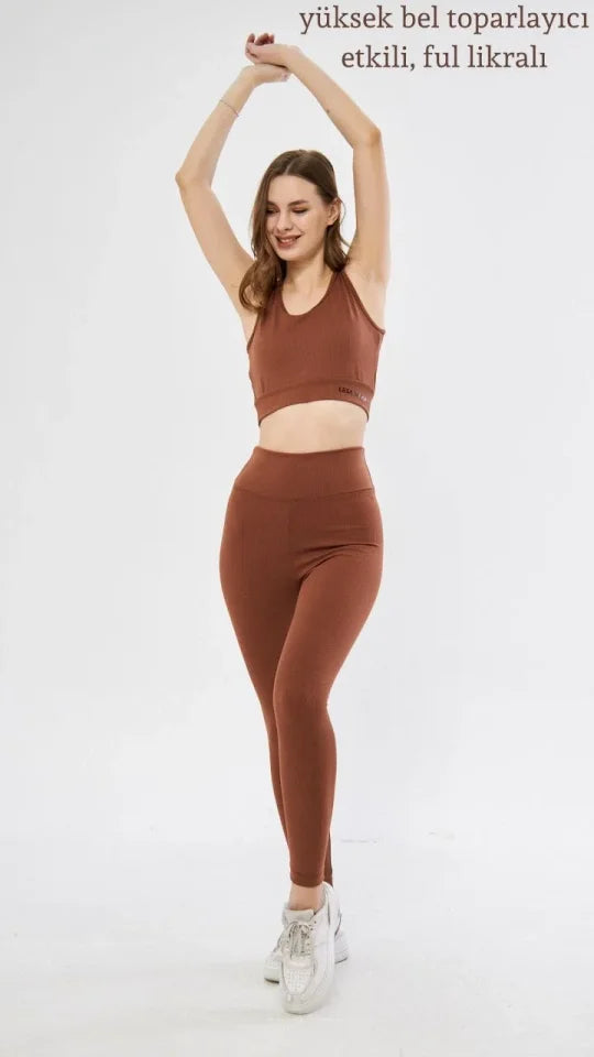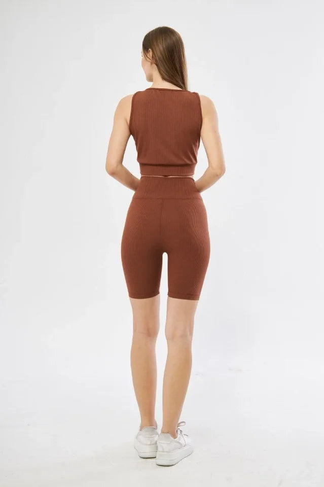 Yüksek Bel Fitilli Croplu Biker Şortlu Takım - Kahve